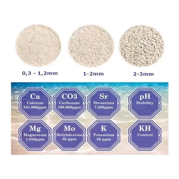 - Verrijkt met essentiële mineralen: Naast calcium bevat het zand ook strontium, magnesium, molybdeen en kalium, die belangrijk zijn voor de groei van koralen en planten.