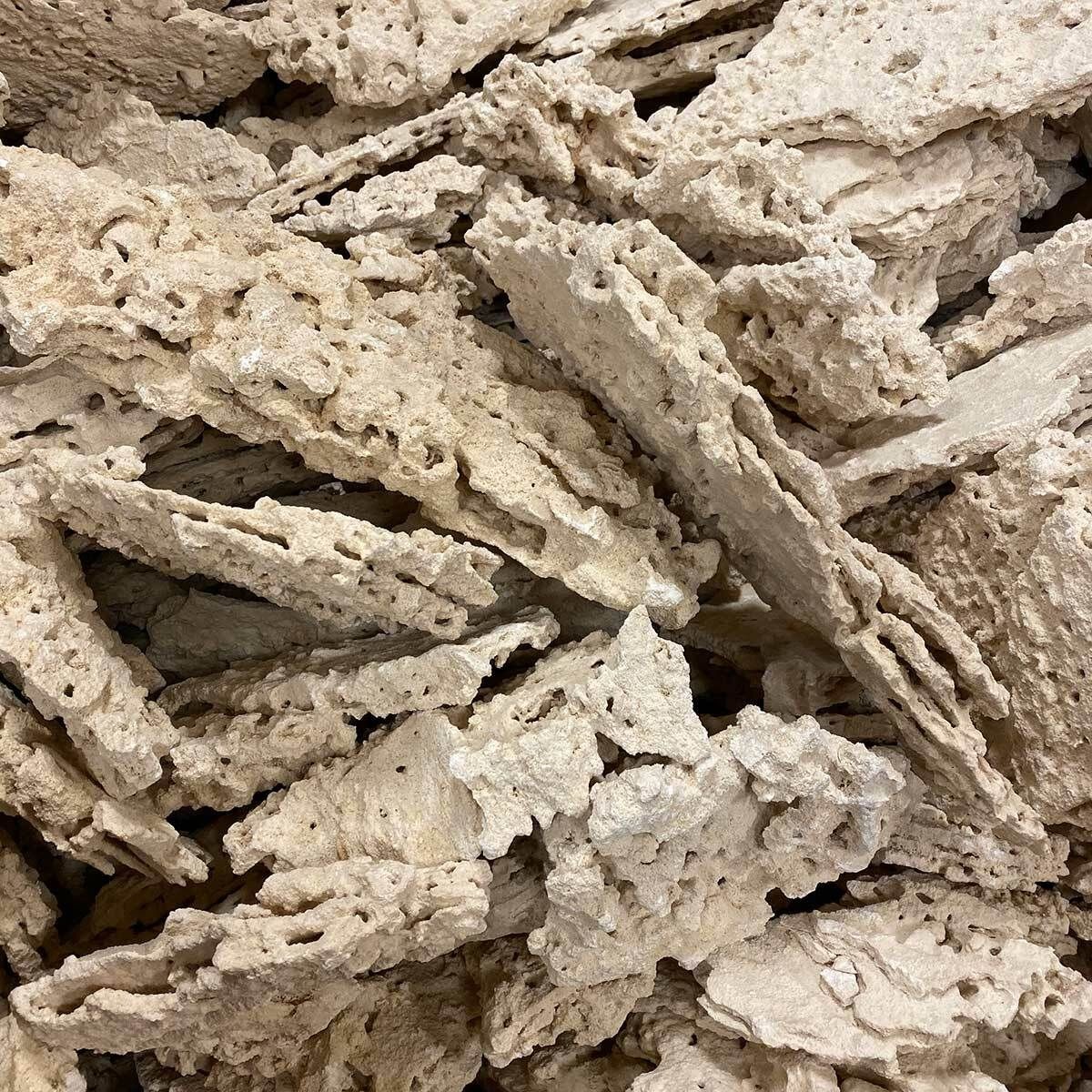 Geheel natuurlijk calciumcarbonaatgesteente. Nooit chemicaliën, additieven. Vaak kun je gefossiliseerde oude koralen in de rotsen zien. Het komt ongedierte en biologisch vrij.