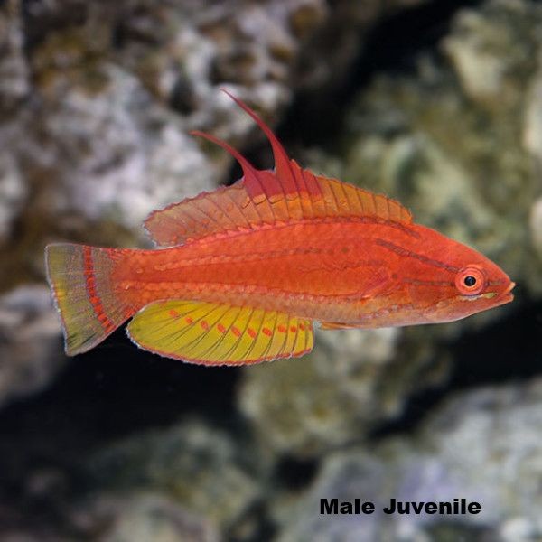 Der Gelbflossen-Lippfisch wird etwa 8 cm lang und schläft nicht wie viele andere Lippfische im Sand, sondern versteckt sich im Riff. Dieser Fisch wird am besten als Paar oder Harem gehalten, also 3 Weibchen und 1 Männchen.
