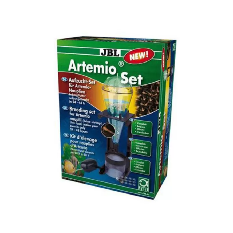 Stellen Sie den Brutbehälter in die entsprechende Halterung. Wasser einfüllen, Spezialsalz und Artemia-Eier (nicht im Lieferumfang enthalten) in den Behälter geben. Schließen Sie den Brutbehälter. Luftpumpe anschließen und 24 - 48 Stunden lüften lassen. Tank am unteren Absperrventil öffnen. Das Kulturwasser läuft durch das Sieb und lässt die Artemia zurück.