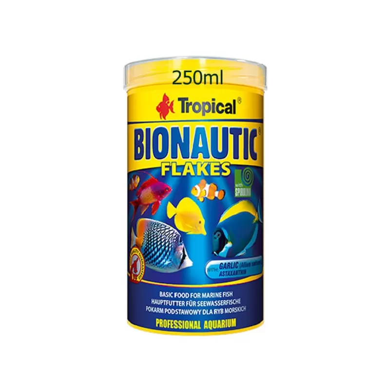 Wenn Sie dennoch nach einer vollwertigen täglichen Ernährung für Ihre kleinen und mittelgroßen Meeresfische suchen, entscheiden Sie sich für Tropical Bionautic Flakes. Das Futter enthält hauptsächlich Rohstoffe aus dem Meer, die für eine hervorragende Kondition der Fische sorgen. Darüber hinaus enthalten die Bionautic Flakes auch 8,75 % Spirulina, das reich an leicht assimilierbaren Proteinen, Vitaminen, Spurenelementen und natürlichen Carotinoiden ist. Es erleichtert auch das reibungslose Funktionieren des Verdauungstraktes und schützt somit die Fische auch vor den gefährlichen Folgen einer Verstopfung.