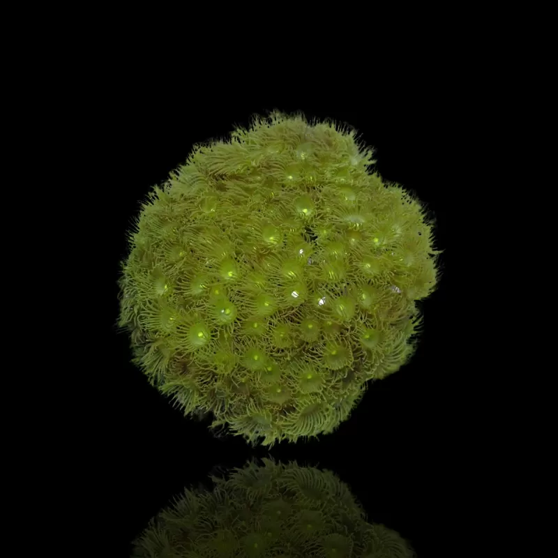 Die Yellow Colony Polyp Corals sind Kolonialtiere mit mehreren einzelnen Polypen, die an einem Stück lebendem Stein oder Korallenstücken befestigt sind. Sie haben eine leuchtend gelbe Farbe und ihre Polypen haben die Fähigkeit, andere Polypen oder Korallen zu stechen. Obwohl der Stich nicht stark ist, sind sie halbaggressiv und brauchen Platz zwischen ihrer Kolonie und ihren Nachbarn.