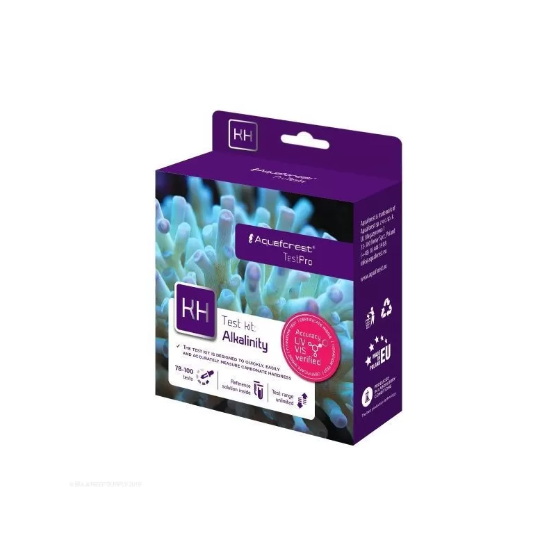 Aquaforest TestPro Alkalinity dient zur schnellen Messung der Karbonathärte (dKH) und Alkalinität (meq/l) in Meerwasser. Die Alkalinität sollte regelmäßig zusammen mit anderen wichtigen Wasserparametern wie Calcium und Magnesium analysiert werden. Empfohlene Karbonathärte: 6,5-8,0 dKH. Das Testkit enthält ausreichend Reagenzien, um ca. 78-100 separate Tests innerhalb dieses Bereichs.