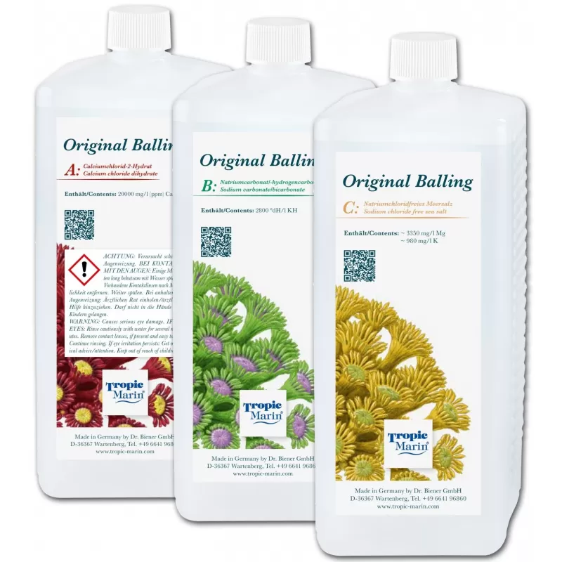Das BIO-CALCIUM ORIGINAL BALLING-Flüssigkeitsset besteht aus drei Salzlösungen A, B und C nach der bekannten Balling-Methode. Bei der dreiteiligen Methode werden Calciumchlorid-Dihydrat (Teil A) und Natriumbicarbonat (Teil B) zugesetzt, während die Zugabe von natriumchloridfreiem Meersalz (Teil C) das entscheidende Ionengleichgewicht im Aquarienwasser aufrechterhält. Diese ausgewogene Kalziumdosis schafft die besten Voraussetzungen für ein gutes Wachstum von Korallen und Korallenalgen und vermeidet den unvermeidlichen Verlust wichtiger Elemente, der bei zweiteiligen Methoden auftritt.