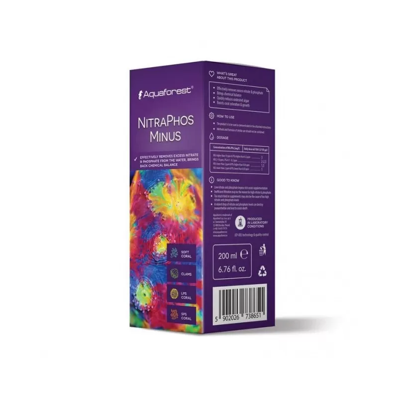 NitraPhos Minus is een unieke formule die nitraat, nitriet en fosfaat biologisch uit het aquarium verwijdert. Het activeert het metabolisme in verschillende soorten bacteriën, die verantwoordelijk zijn voor het beheer en de verwijdering van overtollige voedingsstoffen. Dankzij de speciale samenstelling van meerdere vormen van organische koolstof, aminozuren en vitaminen, vinden alle biochemische veranderingen zonder problemen plaats en bacteriën absorberen gemakkelijk verbindingen om ze in biomassa om te zetten. Die biomassa wordt een waardevol voedsel voor koralen, terwijl de overmaat en restanten ervan uit het water worden verwijderd door filter of skimmer. NitraPhos Minus verbetert de algehele conditie van koralen, zorgt voor een betere kleuring en bevordert de groei. Door het behoud van het biologisch evenwicht in het aquarium wordt de vorming van ongewenste groene algen en de ontwikkeling van cyanobacteriën voorkomen.