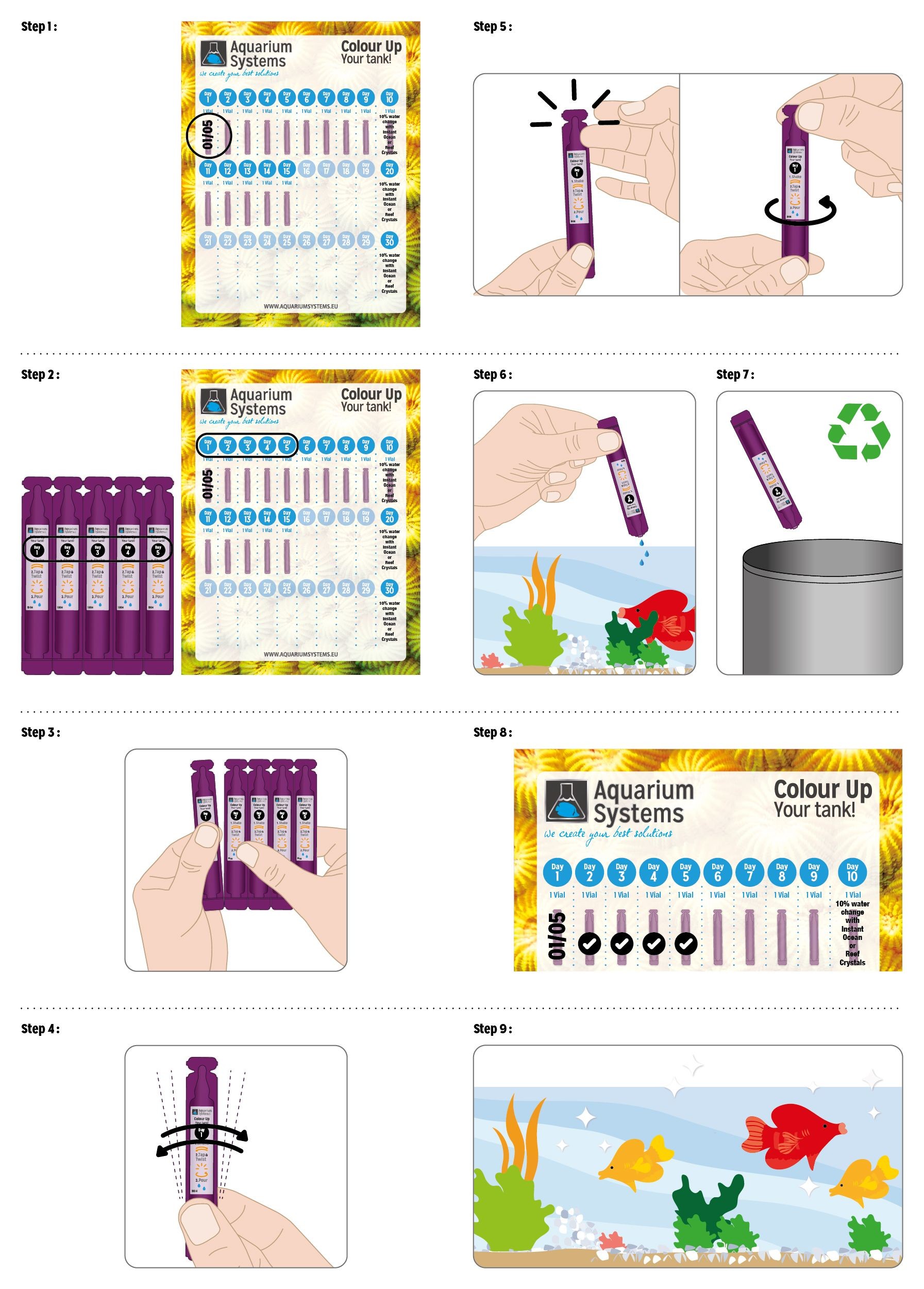De meeste koralen verliezen langzaam hun schitterende kleuren omdat ze niet alle voedingsstoffen binnenkrijgen die ze nodig hebben. Dit komt doordat koralen filterfeeders zijn en normaal gesproken veel bacteriën binnenkrijgen, waar ze het grootste deel van hun voeding uit het water halen. Echter, door te veel afromen en het gebruik van UV-sterilisatoren bevat aquariumwater zeer weinig bacteriën. De oplossing voor dit probleem is om voedingsstoffen terug in de koralen te krijgen met ons aanbevolen Color Up-programma. We combineren een selectie van nuttige bacteriën plus een breed scala aan vitamines, die vervolgens door de koralen worden opgenomen. De mix van vitamines en andere voedingsstoffen wordt vervolgens door de koralen gebruikt en geeft ze een gezonde, natuurlijke kleur. Volg gewoon het dagelijkse programma om alle koraalkleurvoeding terug te geven aan uw aquarium. Start het programma met de eerste flacon en gebruik vervolgens de eenvoudig te volgen gids om fantastische resultaten te bereiken. We raden sterk aan om regelmatig watertesten uit te voeren en het programma het hele jaar door te blijven gebruiken.