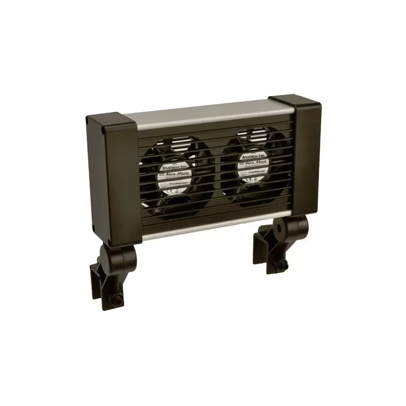 Krachtige ventilator in warmteafvoerende aluminium-kunststof behuizing voor koeling van het aquariumwater door verdampingskoeling. Afmeting 16 x 4 x 15 cm