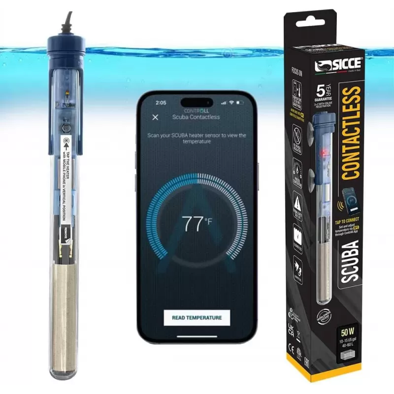 Sicce tilt de aquariumverwarming naar een hoger niveau met hun Scuba Contactless verwarmers. Ze zijn voorzien van gepatenteerde “contactloze” temperatuurregeling, waardoor de temperatuur moeiteloos kan worden aangepast en gecontroleerd via de gratis ContrAll app. De temperatuur kan worden ingesteld van 15°C tot 35°C met een precisietolerantie van slechts ± 1°C.