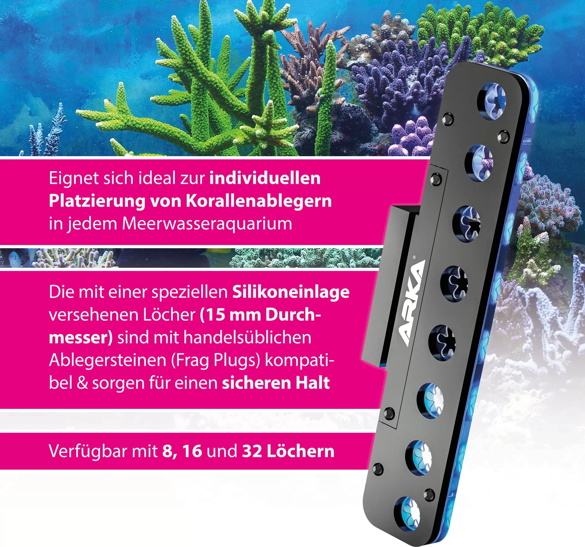 - Capaciteit: 8 gaten voor koraalfragmenten.