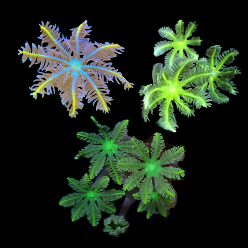 - Drie soorten Clavularia: Een mooie mix van kleurijke poliepen.