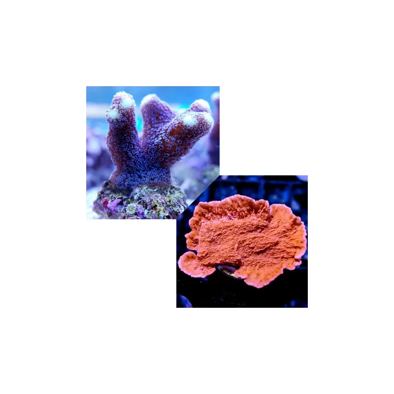 Duo Pack Stylophora Paars M-Size en Montipora Rood M-Size Pack bevat twee koralen die eigenlijk iedereen die SPS koralen wilt houden wel moet hebben. Deze koralen zijn wat SPS koralen betreft vrij gemakkelijk te houden en groeien in een bak met stabiele waterwaardes erg snel. Beide koralen zijn in M-Size maatvoering, wat gelijk een mooi stuk is om mee te starten