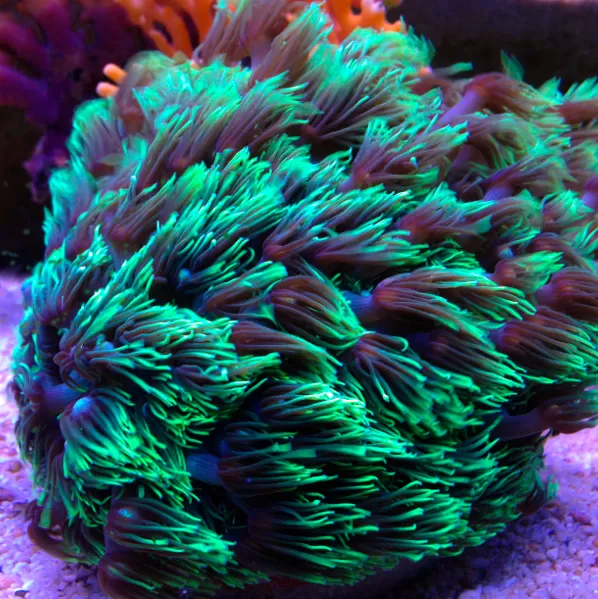 Dit koraal staat bekend om zijn intens heldergroene poliepen die in bloemetjesvorm uitwaaieren en elegant meebewegen met de stroming, wat zorgt voor een levendig en dynamisch visueel effect.Dankzij de compacte groeivorm en de bijzondere kleur is dit een geliefde soort onder aquarianen.