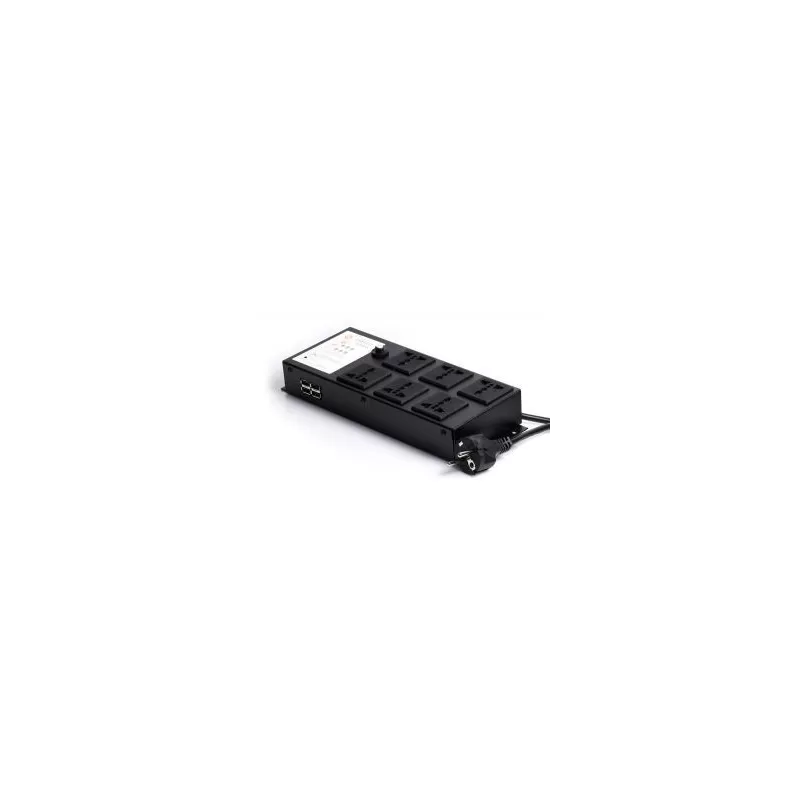 - Zes regelbare stopcontacten. Alle uitgangen worden geregeld door mechanische hoogspanningsrelais met een nominaal vermogen van 8A.