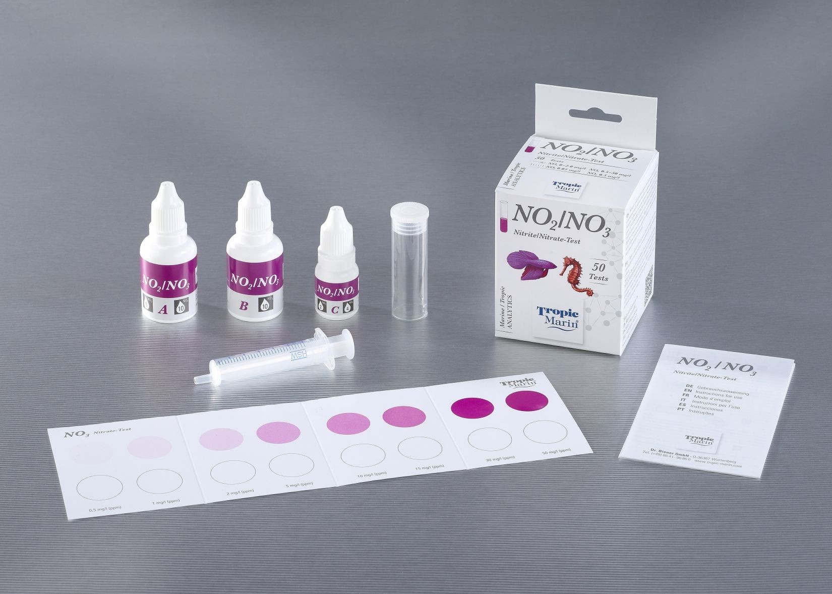 Met de Tropic Marin® Nitriet / Nitraat-Test kunnen de nitriet- en nitraatconcentraties worden bepaald met behulp van een fijn afgestemde kleurenkaart met een bereik van concentraties voor nitriet tussen 0 - 2 ppm en voor nitraat tussen 0 - 50 ppm.