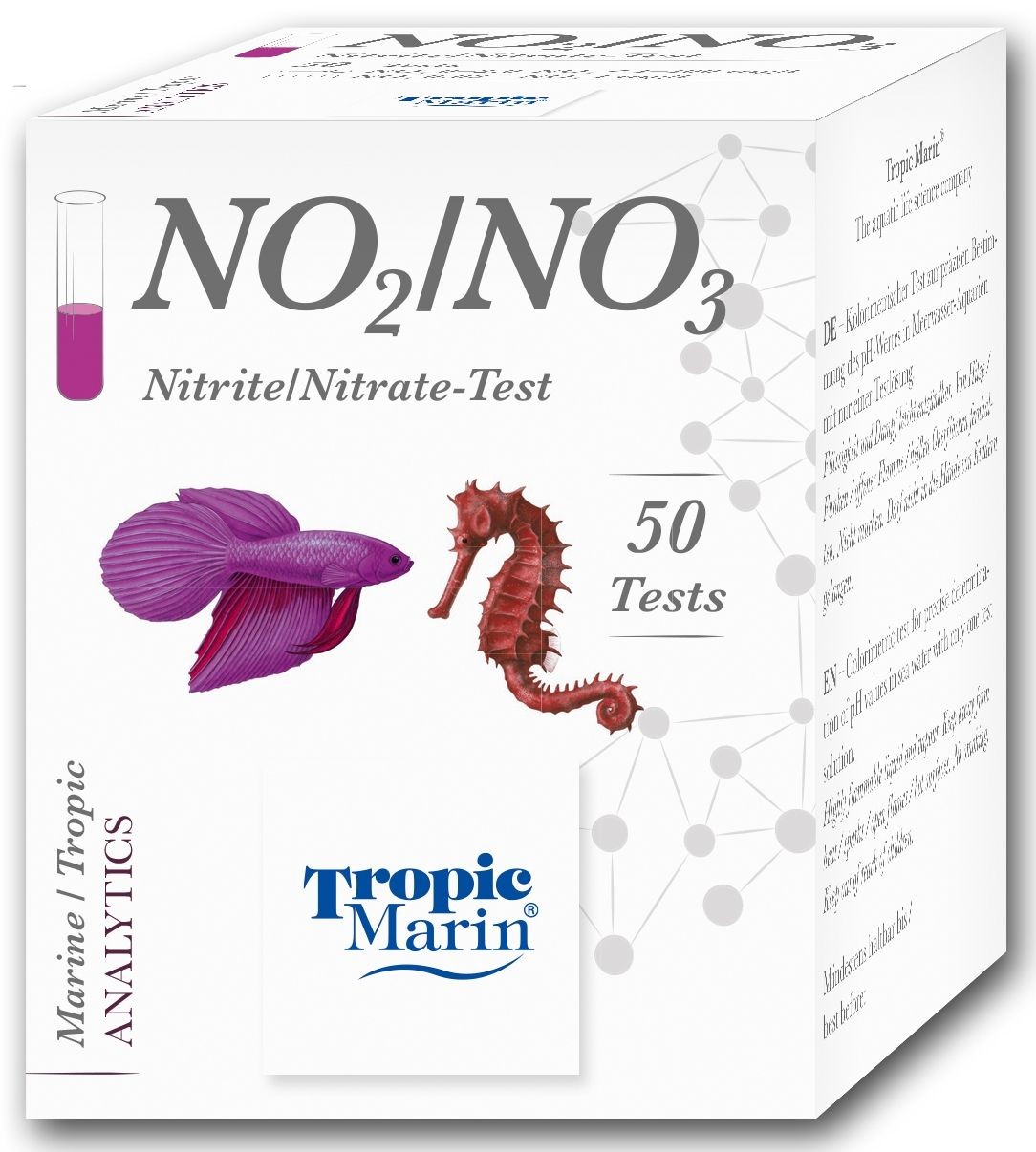 Met de Tropic Marin® Nitriet / Nitraat-Test kunnen de nitriet- en nitraatconcentraties worden bepaald met behulp van een fijn afgestemde kleurenkaart met een bereik van concentraties voor nitriet tussen 0 - 2 ppm en voor nitraat tussen 0 - 50 ppm. Geschikt voor zoet- en zoutwater