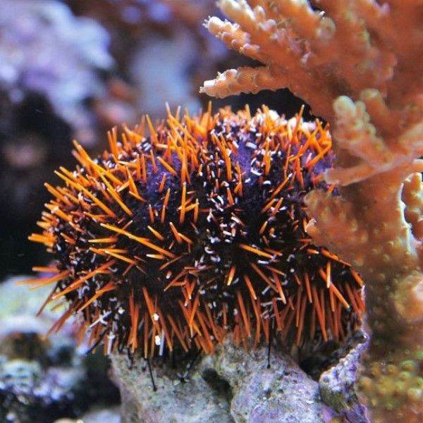 - Relatief traag bewegend en vreedzaam, maar kan agressief zijn tegenover andere zee-egels.