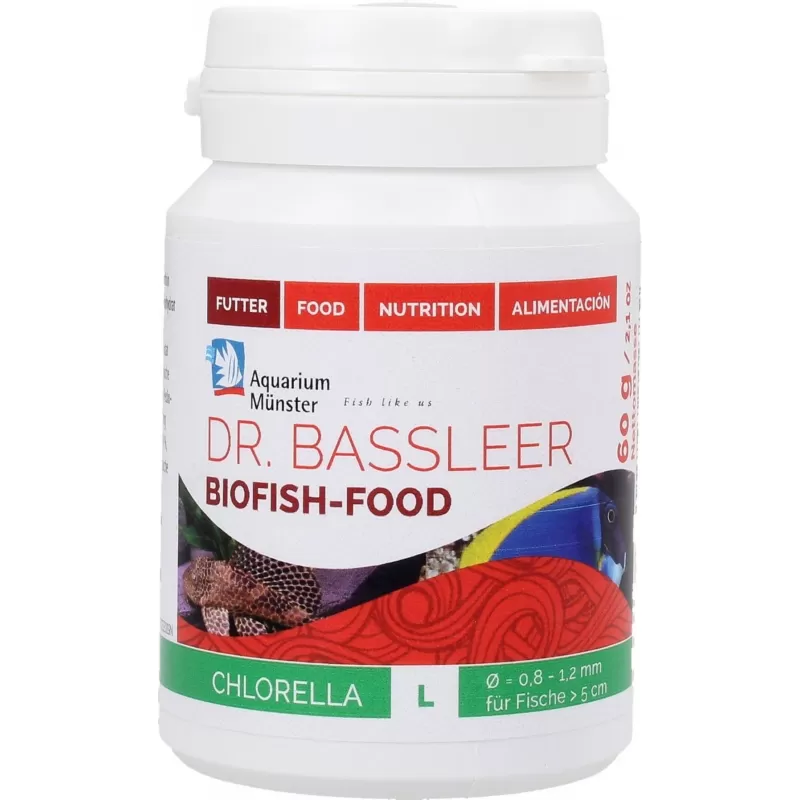 Dr. Bassleer Biofish Food chlorella bevat alle natuurlijke componenten die nodig zijn voor een goede uitgebalanceerde voeding. Daarnaast bevat het ook de waardevolle zoetwater alg chlorella pyrenoidosa. Deze algen zijn rijk aan carotenoïden (bijvoorbeeld luteïne, astaxanthine), antioxidanten (zoals beta-caroteen), essentiële onverzadigde vetzuren (bijv. omega-3), vitaminen en sporenelementen (ijzer, selenium, jodium, foliumzuur, calcium), Chlorofyl en waardevolle nucleïnezuren. Dr. Bassleer Biofish Food chlorella is licht verteerbaar, waardoor het voer het aquariumwater niet belast.