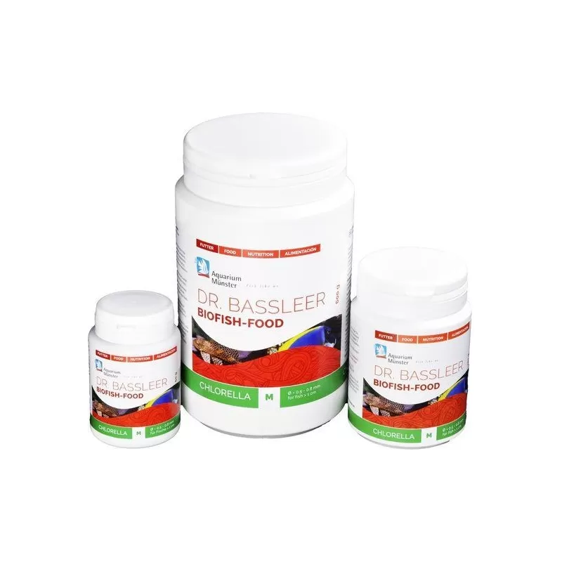 Dr. Bassleer Biofish Food chlorella bevat alle natuurlijke componenten die nodig zijn voor een goede uitgebalanceerde voeding. Daarnaast bevat het ook de waardevolle zoetwater alg chlorella pyrenoidosa. Deze algen zijn rijk aan carotenoïden (bijvoorbeeld luteïne, astaxanthine), antioxidanten (zoals beta-caroteen), essentiële onverzadigde vetzuren (bijv. omega-3), vitaminen en sporenelementen (ijzer, selenium, jodium, foliumzuur, calcium), Chlorofyl en waardevolle nucleïnezuren. Dr. Bassleer Biofish Food chlorella is licht verteerbaar, waardoor het voer het aquariumwater niet belast.