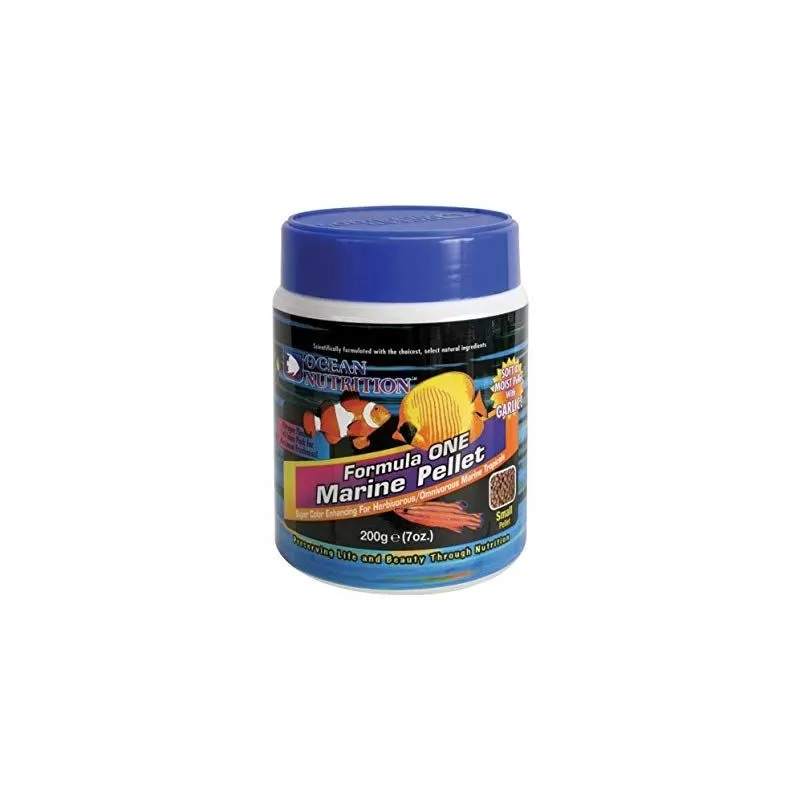 Ocean Nutrition Formula 1 Marine Pellets Small 400 gram zijn perfect zachte en vochtige pellets voor carnivore en omnivore zeewatervissen. Dit voer heeft een aantal belangrijke voordelen voor je vissen. De voeding bevat namelijk een hoog eiwitgehalte en is rijk in vitamines. Daarnaast bevat het voer extra spirulina voor de herbivore vissen. De kleur van je vissen wordt versterkt en de gezondheid en de vitaliteit van je vissen blijft behouden. Ook is de voeding voorzien van knoflook om de weerstand tegen ziektes te verhogen. Het water vertroebelt niet door het gebruik van dit voer en het is verpakt in met stikstof gespoelde foliezakken om een maximale versheid te garanderen.