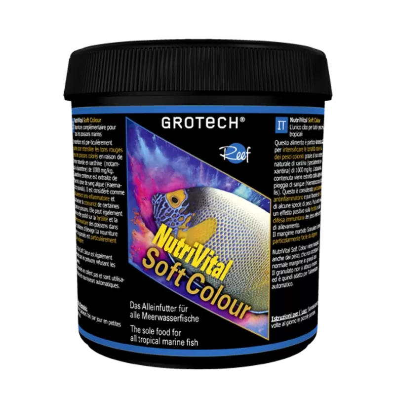 Grotech NutriVital Soft Colour is speciaal ontworpen visvoer dat niet alleen de natuurlijke kleuren van je tropische zeevissen versterkt, maar ook bijdraagt aan hun algehele gezondheid. Deze zachte granulaatjes, verrijkt met natuurlijke pigmenten, vitamines en mineralen, zorgen ervoor dat je vissen stralen in hun mooiste kleuren.