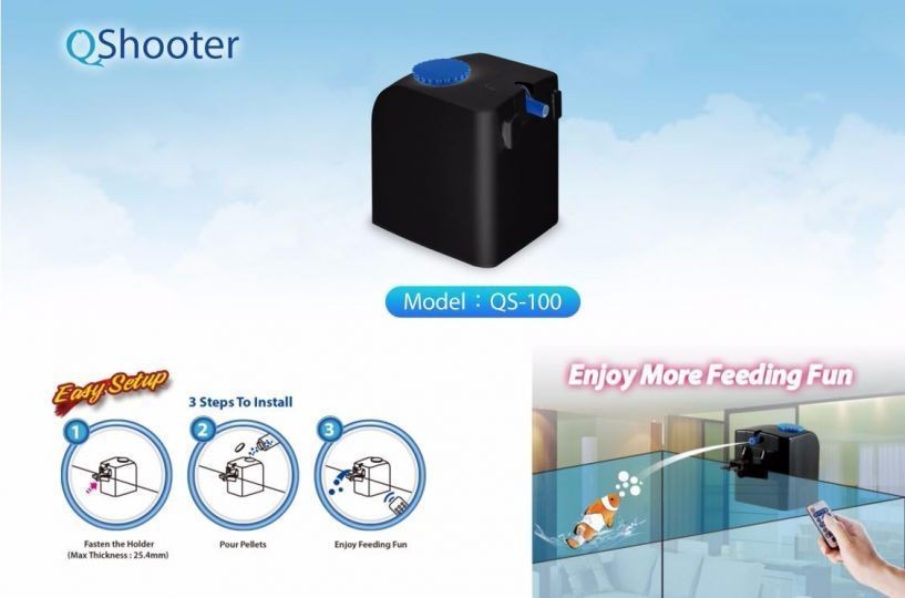 Qshooter is een pelletpistool dat grappig en leuk is om te gebruiken. Het wordt bediend met de afstandsbediening en maakt het mogelijk de vis op een ongewone manier te voeren door deze pellet in het aquarium te schieten.