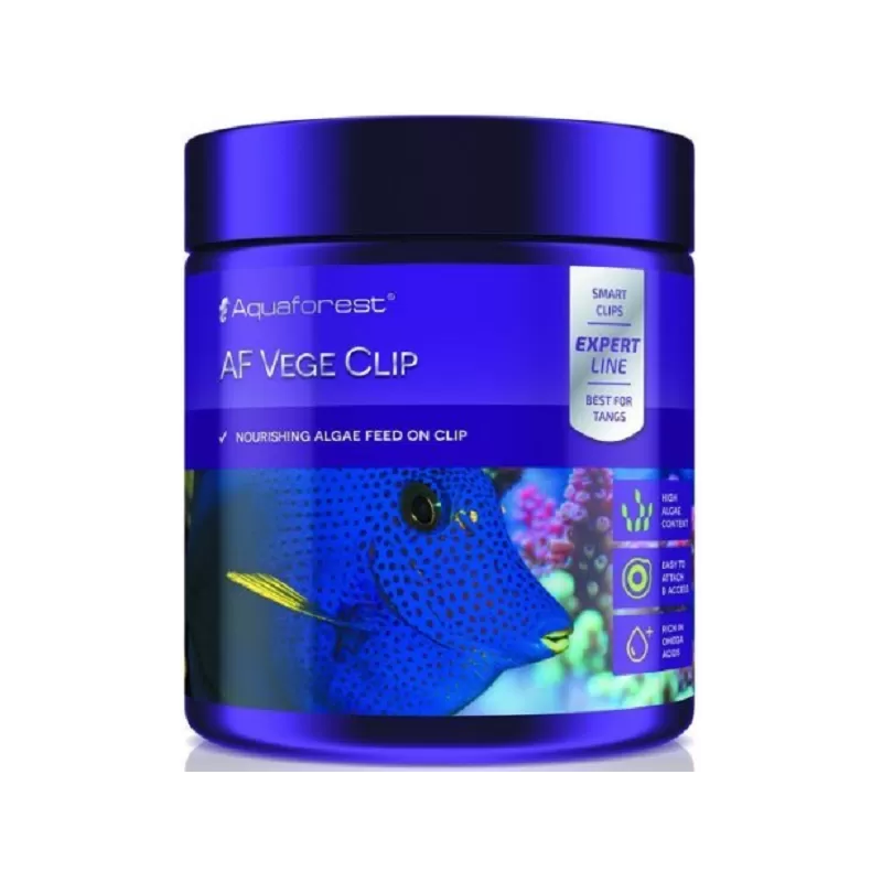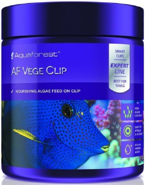 Speciaal voer bestemd voor onder meer herbivore vissen. Om een goede ontwikkeling te garanderen, bestaat resistentie tegen ziekten AF Vege Clip bestaat uit 7 algensoorten en is verrijkt met fytoplankton, mineralen en vitamines en vormt een compleet uitgebalanceerd dieet voor alle soorten vissen. Het voer wordt op de clip geplaatst zodat het in elk deel van het aquarium kan worden opgehangen waardoor de vissen vrij kunnen zwemmen en eten.