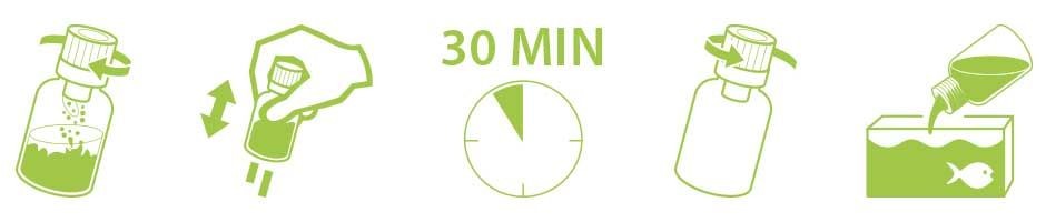 We raden aan om het product om de twee weken en indien nodig regelmatig te gebruiken. Draai de capsule met de klok mee om de verzegeling te verbreken en de bacterie / enzymverbinding in de oplossing vrij te geven. Schud de fles kort en laat hem vervolgens ongeveer 30 minuten op kamertemperatuur staan. Gedurende deze tijd worden de bacteriën geactiveerd en kunnen vervolgens in het filter of rechtstreeks in het aquarium worden geplaatst.