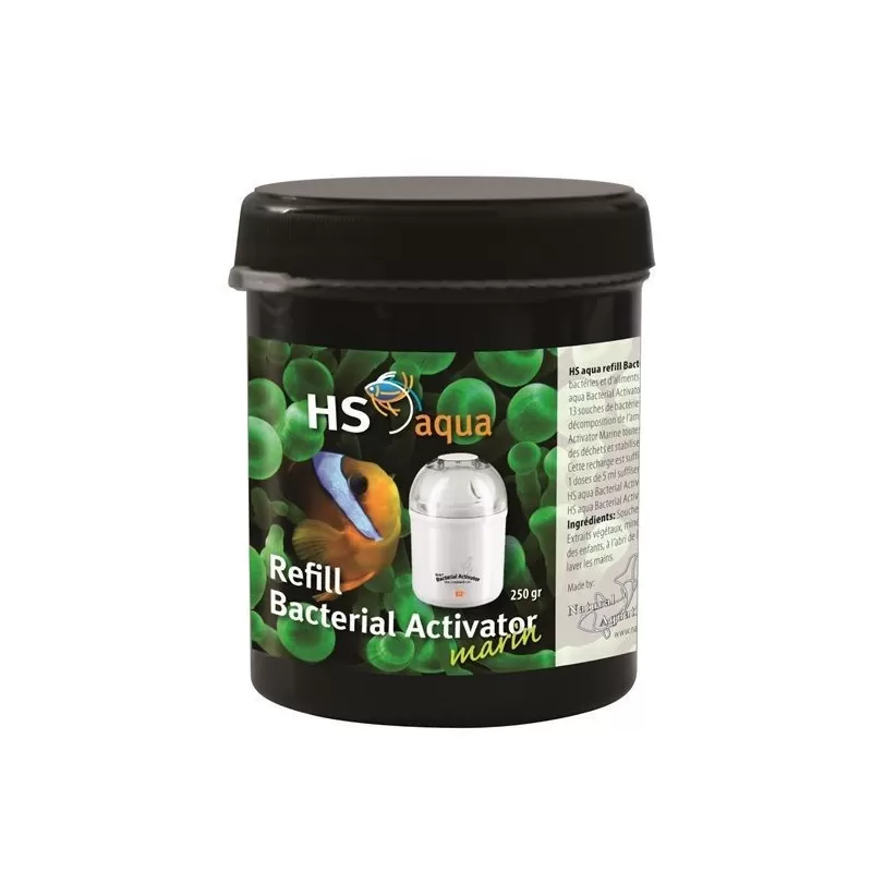 De toegevoegde HS aqua Refill Bacterial activator Marine is een unieke combinaties van voeding met bacteriën. Ze zijn speciaal ontwikkelt voor de HS aqua Bacterial Activator en bevatten 13 soorten bacteriestammen. Deze zorgen voor een optimale bacteriologische afbraak van organisch vuil, ammoniak en nitriet in het aquarium.