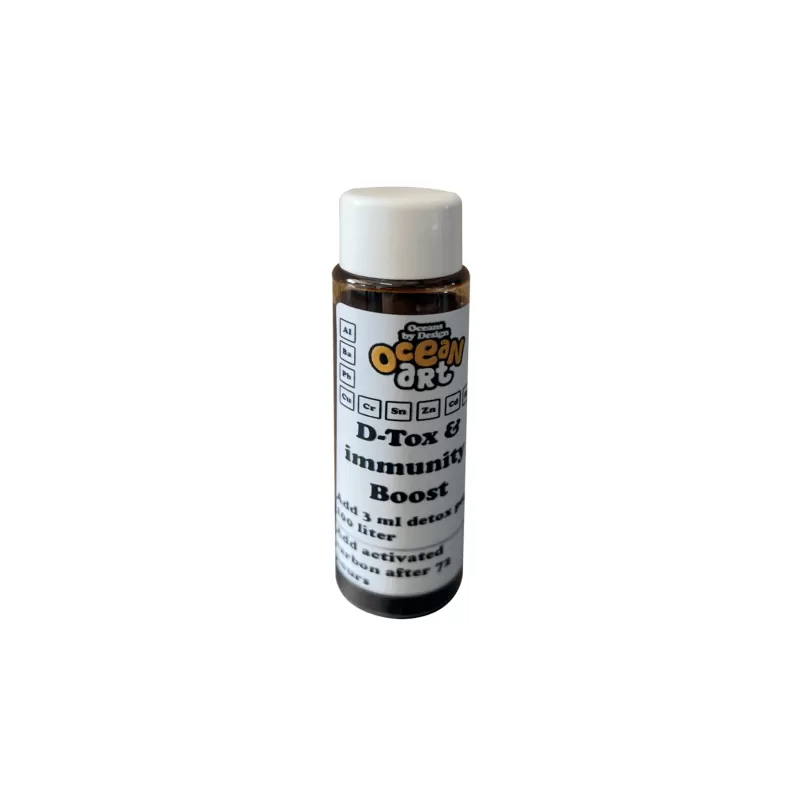 Ocean Art D-Tox & Immunity Boost verwijdert alle zware metalen in het zeeaquarium. Het versterkt ook de afweer van vissen. 30 ml is voor 900 liter aquarium.