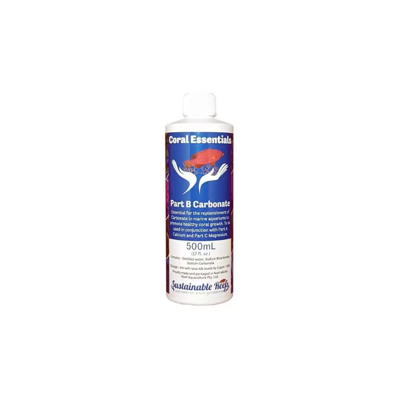 Coral Essentials Deel B Carbonaat is een geconcentreerde vloeibare oplossing van carbonaat- en bicarbonaatzouten, 200.000 ppm (mg / L) of 11.200 DKH. Carbonaat is ook een essentiële component in de vorming van skeletten van calciumcarbonaat, dwz koraalgroei.