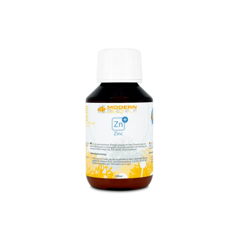 Modern Reef Zn+ 100ml (Zinc) is een premium supplement voor het handhaven van het zinkgehalte in je rifaquarium. Zink is een essentieel spoorelement voor mariene organismen, inclusief koralen, en speelt een cruciale rol in enzymatische processen die betrokken zijn bij hun groei en gezondheid. Met Modern Reef Zn+ zorg je voor een stabiel zinkniveau in je aquarium, wat bijdraagt aan een gezonde en bloeiende rifomgeving.