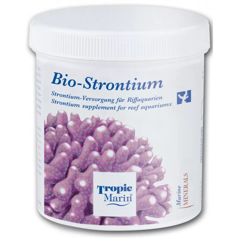 Tropic Marin Bio-Strontium is gemaakt voor het biologisch ideale strontiumsupplement in rifaquaria. Een voldoende aanvoer van strontium is net zo essentieel voor de groei en het welzijn van rifbouwende koralen als calcium. In het rifaquarium kan de strontiumconcentratie snel dalen tot lage waarden door biologische processen, neerslag en opname in het kalkstenen skelet. Tropic MarinBio-Strontium creëert een natuurlijke omgeving in het aquarium en levert strontium en koolstofdioxide in een natuurlijke, biologisch beschikbare, poedervorm en ondersteunt zo de gezonde ontwikkeling van koraal. Tropic Marin Bio-Strontium verstoort de ionenbalans niet in tegenstelling tot de enkelvoudige toevoeging van strontiumchloride.