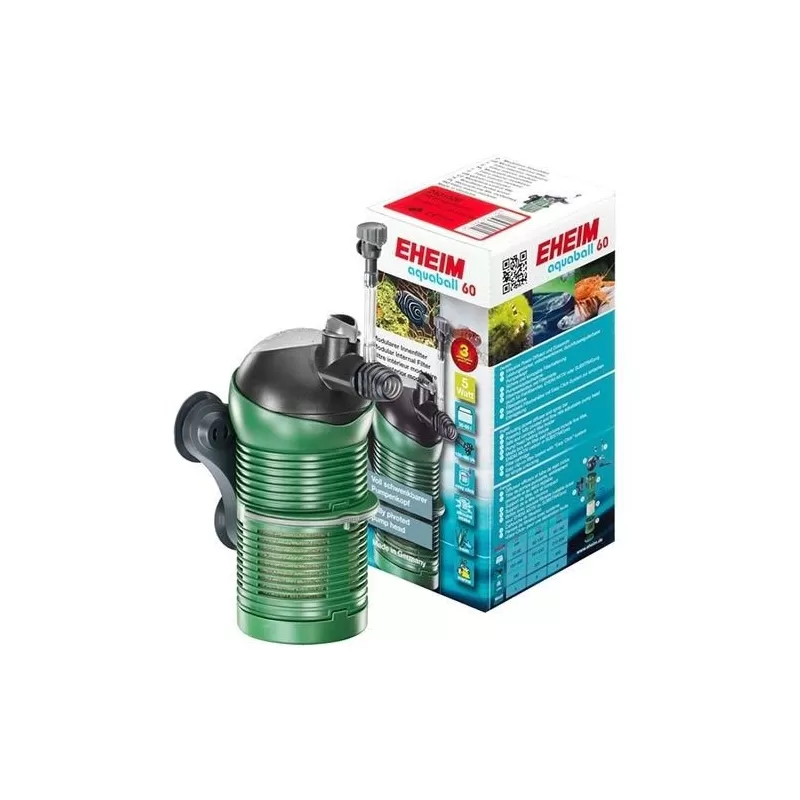 Eheim Aquaball, met inbegrip van de powerdiffuser voor sterke zuurstofverrijking en spray bar voor natuurlijke oppervlakte beweging. Hij is krachtig, volledig draaibaar en heeft een debiet verstelbare pompkop. Daarnaast heeft de Eheim Aquaball een nieuwe, veilige en compacte filterhouder. De filter media box bevat een schuimfilter pad (Aquaball 60/130/180); opties omvatten fijn filter pads, EHEIM AKTIV of SUBSTRATpro. Nieuw is de "Easy Click"-vergrendeling voor eenvoudige aansluiting en onthechting van de filtermanden. Hij kan gebruikt worden in zoet- en zeewater.