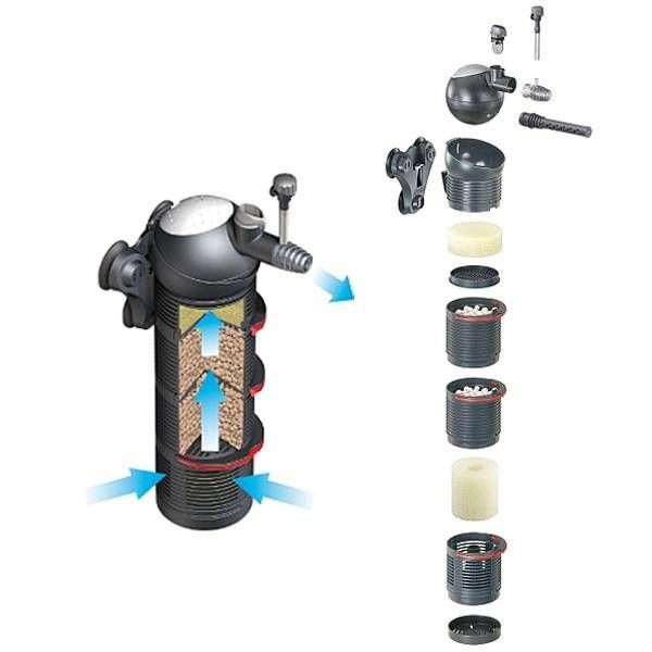 Het bijzondere van biopower is dat het net als een extern filter meerlaagse filtratie biedt. De gesloten filtermanden zijn gevuld met zeer efficiënte filtermedium (bijv.SUBSTRATpro). Onderaan bevindt zich de inlaatkorf met filterpatroon voor de mechanisch-biologische voorfiltratie. Het aan de onderzijde aangezogen water wordt door de verschillende filterlagen naar boven gepompt en na filtratie weer terug in de tank geleid.