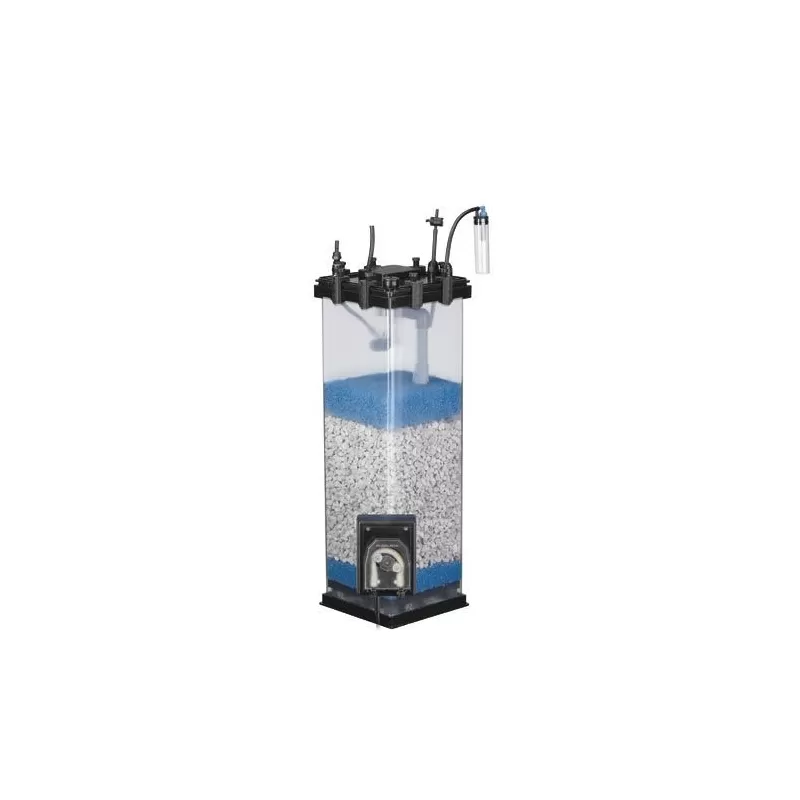 De Calciumreactor KR 1000 is een gesloten systeem en is universeel instelbaar. Hij kan als aftakking van een pomp, onafhankelijk van de waterstand in het aquarium of het filter, gebruikt worden. Zijn kenmerken zijn het grote volume van 10 liter (Hydrocarbonatvulling ca. 10 kg) en een interne watercirculatie