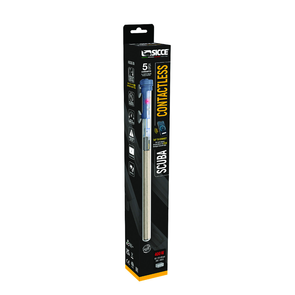 Sicce tilt de aquariumverwarming naar een hoger niveau met hun Scuba Contactless verwarmers. Ze zijn voorzien van gepatenteerde “contactloze” temperatuurregeling, waardoor de temperatuur moeiteloos kan worden aangepast en gecontroleerd via de gratis ContrAll app. De temperatuur kan worden ingesteld van 15°C tot 35°C met een precisietolerantie van slechts ± 1°C.