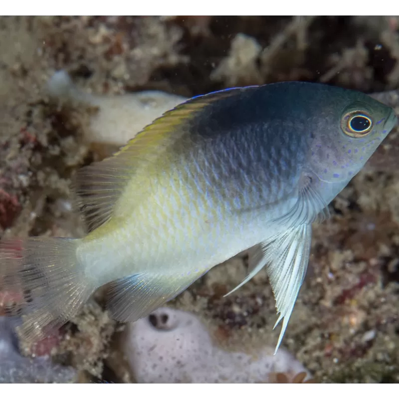 De Saffieren Duivels Juffer is een makkelijke eter, pellets, flakes en diepvriesvoer lusten ze allemaal .