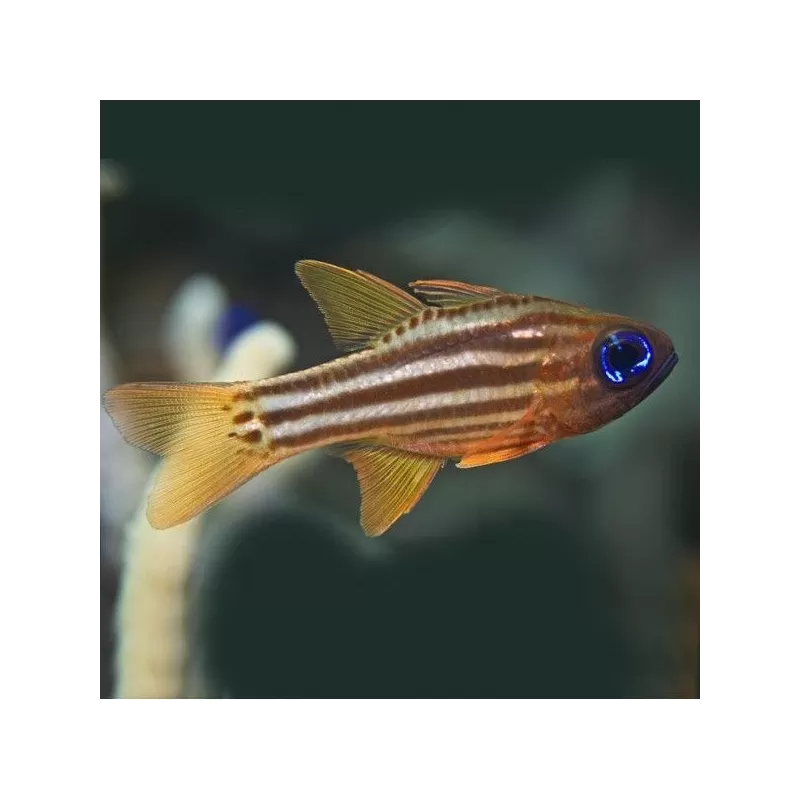De Ocre Striped Cardinal wordt ongeveer 12 cm, en is een zeer rustige zwemmer, en is als koppel of schooltje te houden.