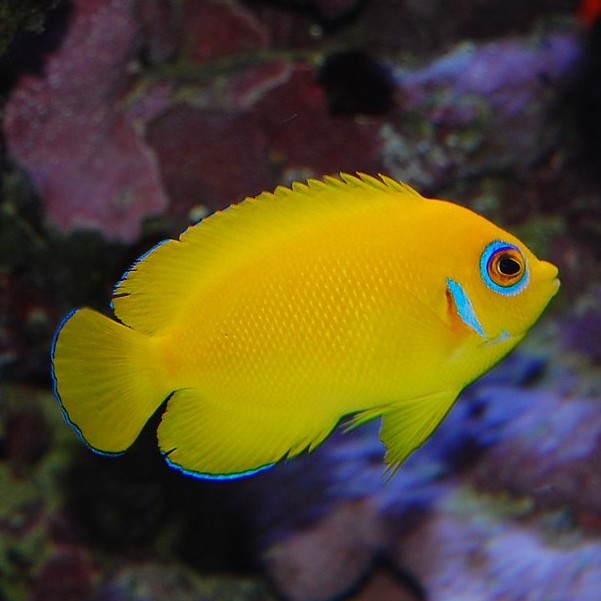 - Uiterlijk: Felgeel lichaam met blauwe randen rond de ogen, kieuwen en vinnen.