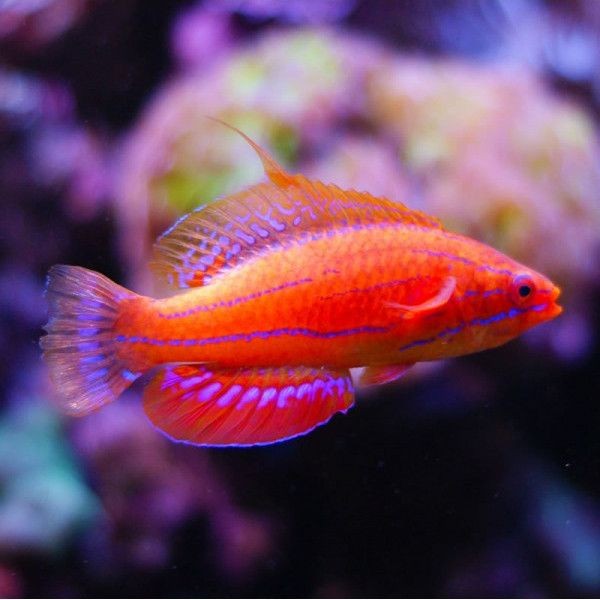 - Uiterlijk: Opvallende oranje en rode tinten met iriserende blauwe lijnen en opvallende vinnen.
