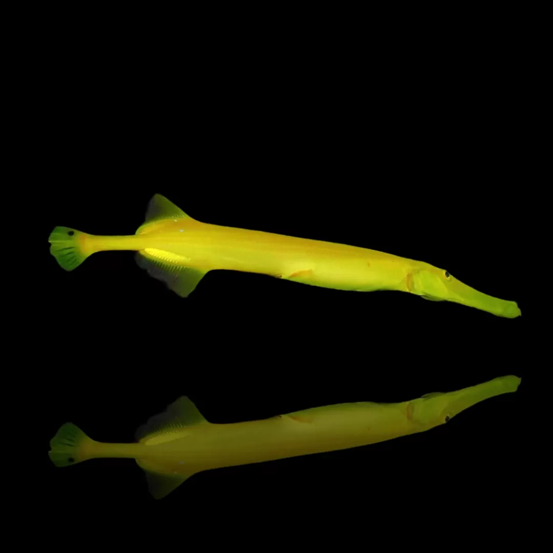 - Kleur: De Chinese Trompetvis heeft een slank, langwerpig lichaam met een groenachtige of bruinachtige kleur, vaak met lichtere vlekken of strepen die helpen bij camouflage.