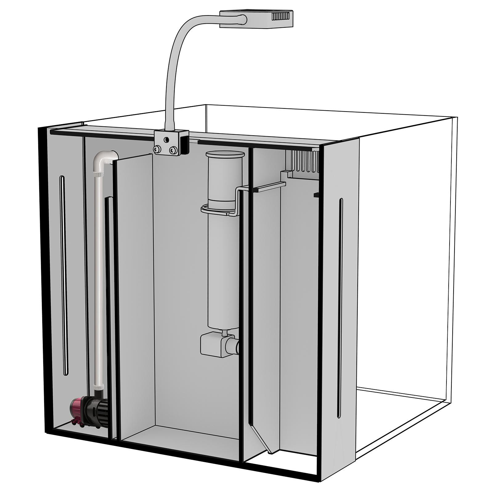 Geïntegreerd filter tank met deksel voor het plaatsen van biologische en mechanische filters (bijv. multireactor S Gen II), incl. voorfilterkamer en helderwaterkamer voor het plaatsen van bijv. bijvulsysteem easy of miniverwarming, incl. oppervlakte-uitlaat en waterniveau-indicator.